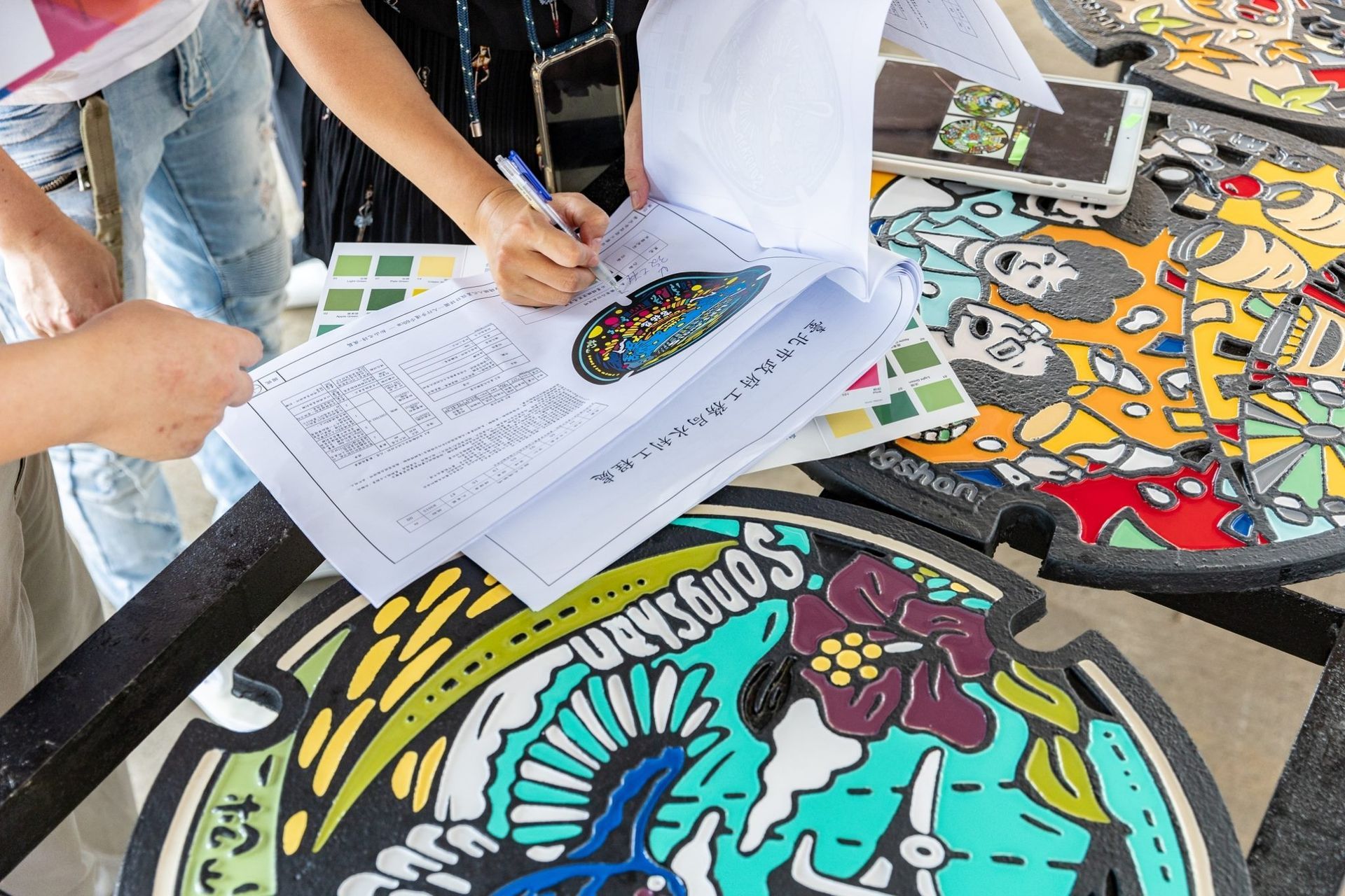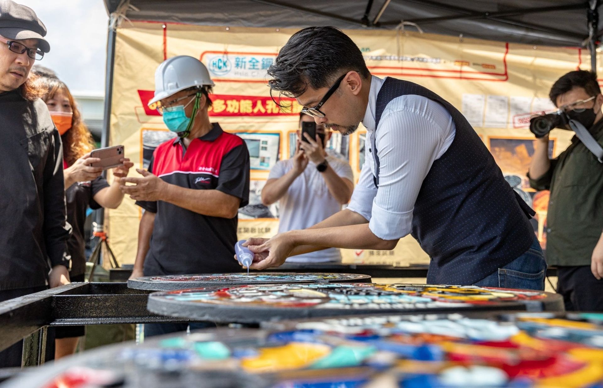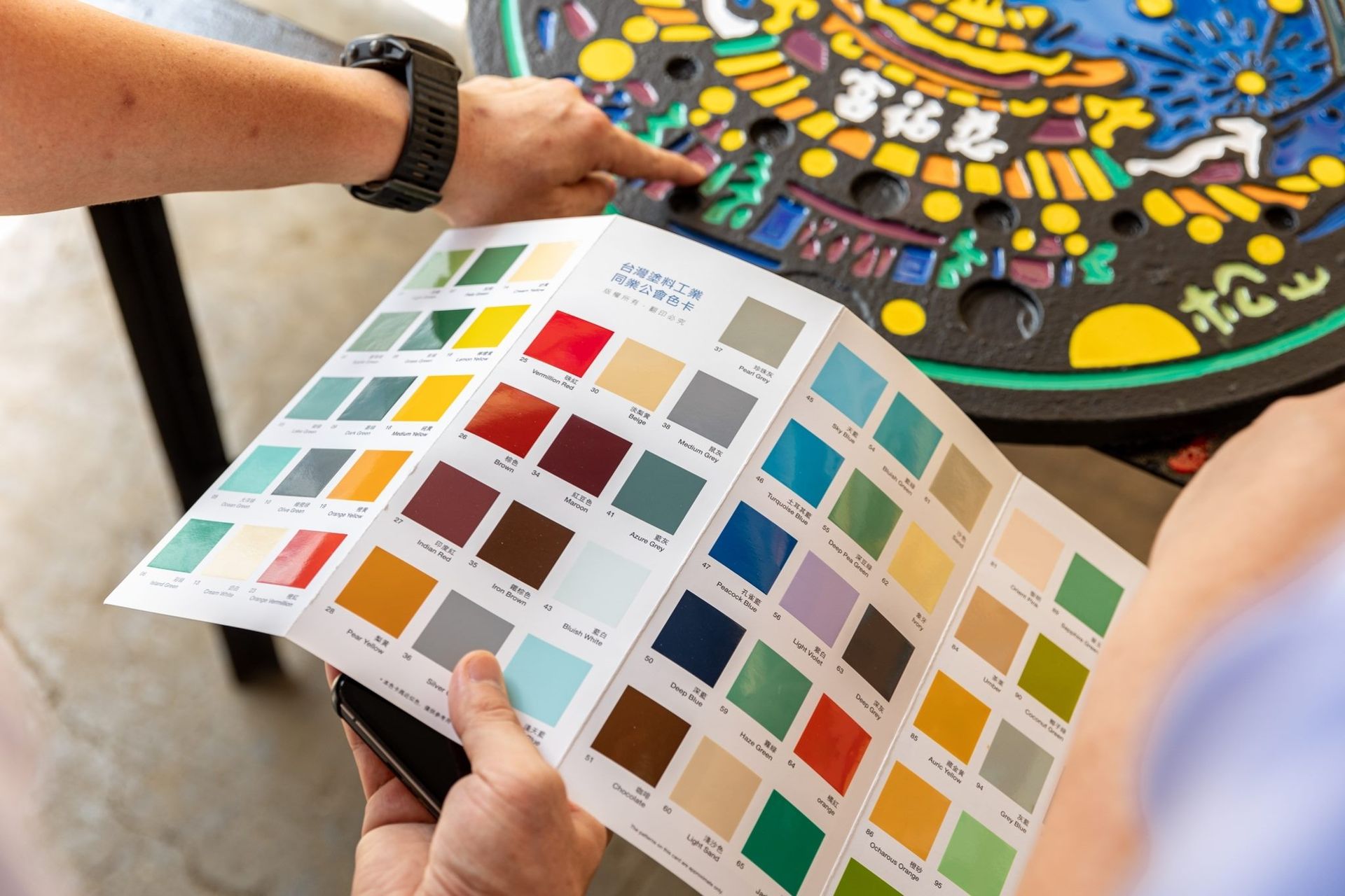 以平面設計來說,PANTONE 色庫總共超過15,000+色,但是在孔蓋製程條件下僅能使用100+色;在配色難度和調色難度都增加許多的狀況下,設計師團隊與工廠多次溝通密切配合,為此本處更派員親自南下至臺中工廠實際體驗了上色的操作,瞭解每座人孔蓋的製作不易。